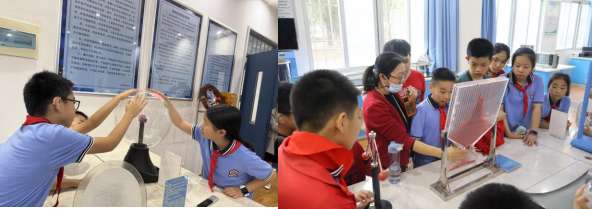 在物理体验与创意空间,讲解老师及大学生志愿者们为少先队员们带来一堂别开生面的科学启蒙课。通过展示力学、光学等基础物理实验,结合通俗易懂的原理讲解,激发了学生对科学的浓厚兴趣。孩子们近距离观察实验现象、亲手触摸仪器模型,在互动体验中感受科学魅力,培育科学精神。