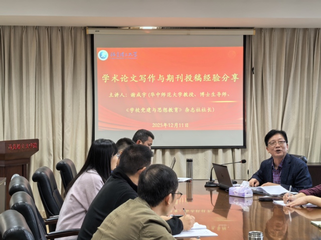 为提升马克思主义学院教师的学术研究能力,助力高水平论文产出,12月11日下午,湖北长江教育报刊传媒集团总编辑、《学校党建与思想教育》杂志社社长谢成宇教授应邀来学院作题为“学术论文写作与期刊投稿经验分享”的专题报告。马克思主义学院教师、部分专职辅导员参加报告会。会议由马克思主义学院院长袁小云教授主持。